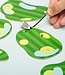 Blikje met klein golfspel. In het blik zitten negen speelvelden, twee mini golfclubs van metaal en twee metalen balletjes. Het zand en water ligt lager in het veld dan het gras. Hiermee kan de golfliefhebber altijd en overal golfen.
